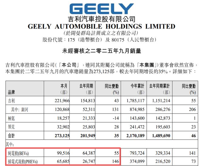 吉利9月銷量達27.31萬輛,同比增長35%,其中新能源銷量達16.52萬輛,同比增長81.27%,環比增長12.12%。