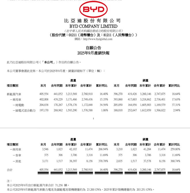 10月1日,比亞迪發布的產銷數據显示,9月新能源汽車銷量為39.63萬輛,同比下降5.52%。