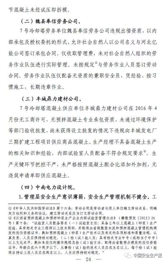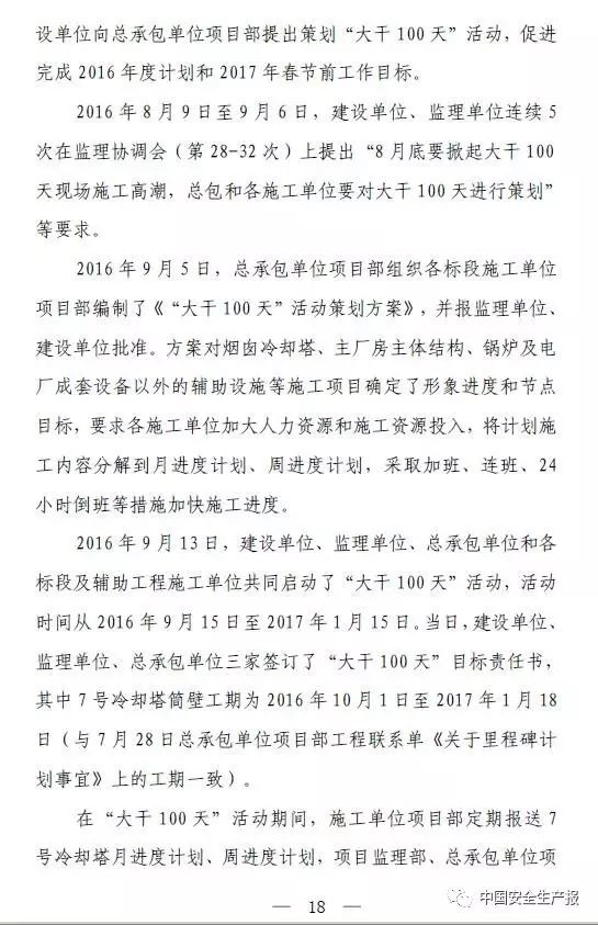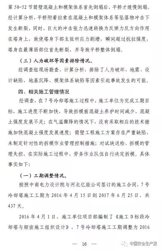 經調查,在7號冷卻塔施工過程中,為完成工期目標,施工進度不斷加快,導致拆模前混凝土養護時間減少,混凝土強度發展不足;在氣溫驟降的情況下,沒有採取相應的技術措施加快混凝土強度發展速度;筒壁工程施工方案存在嚴重缺陷,未制定針對性的拆模作業管理控制措施;對試塊送檢、拆模的管理失控,在實際施工過程中,勞務作業隊伍自行決定拆模。