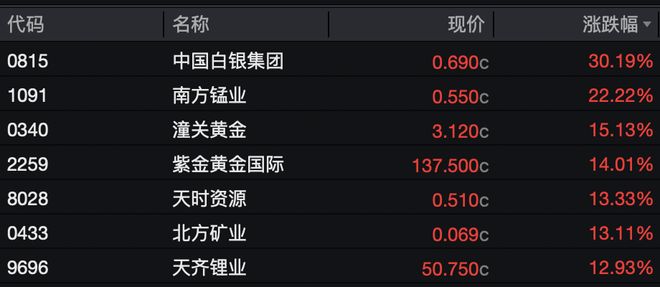 黃金股受金價表現刺激走強,截至收盤,潼關黃金、紫金黃金國際、靈寶黃金分別上漲15.13%、14.01%、10.86%。此外,中國白銀集團收漲超30%,南方錳業漲超22%,天齊鋰業漲近13%。