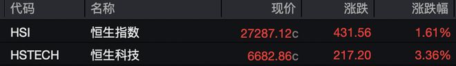 10月2日,港股指數全天震蕩上行。截至收盤,恒生指數大漲431.56點,報27287.12點,創2021年7月23日以來最高收盤價,當日漲幅為1.61%;恒生科技指數漲3.36%,報6682.86點,創2021年11月16日以來收盤新高;恒生中國企業指數漲1.77%,報9724.38點。