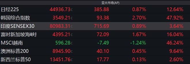 不僅是港股市場,周四亞太主要股指也全線上漲。Wind數據显示,截至10月2日收盤,日經225指數收盤漲0.87%,報44936.73點。韓國綜合指數漲2.7%,報3549.21點,創收盤紀錄新高。澳洲標普200指數收盤漲0.45%,報8945.90點。新西蘭標普50指數收盤漲0.13%,報13451.76點。